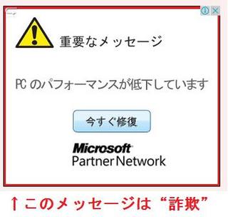 これは“詐欺”だ。 61:パソコン♪パソコン♪ X Facebook はてブ LINE Pinterest コピー 2014.09.06 ↑このメッセージ画像は“詐欺”です。“嘘”です。騙されないで。 レジストリをいじったりするツールに飛ぶだけです。 クリックしてインストールして……する前に、せめて呼んで下さい。 なお、Vista以降では、その手の表示は画面右下のタスクトレイに表示されます。 #念のために言っておくけど、同じ土俵上に降りて“詐欺”だと言っているだけ。法令上の詐欺かどうかは関係ない。