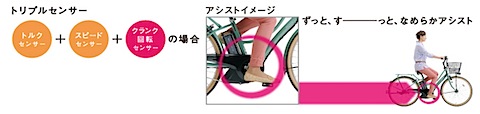 3.クランク回転センサー……ペダルを踏む力はペダルの場所によって平均的ではないが、ペダルが回っていることを入力することで平均的なムラのないアシストをする。