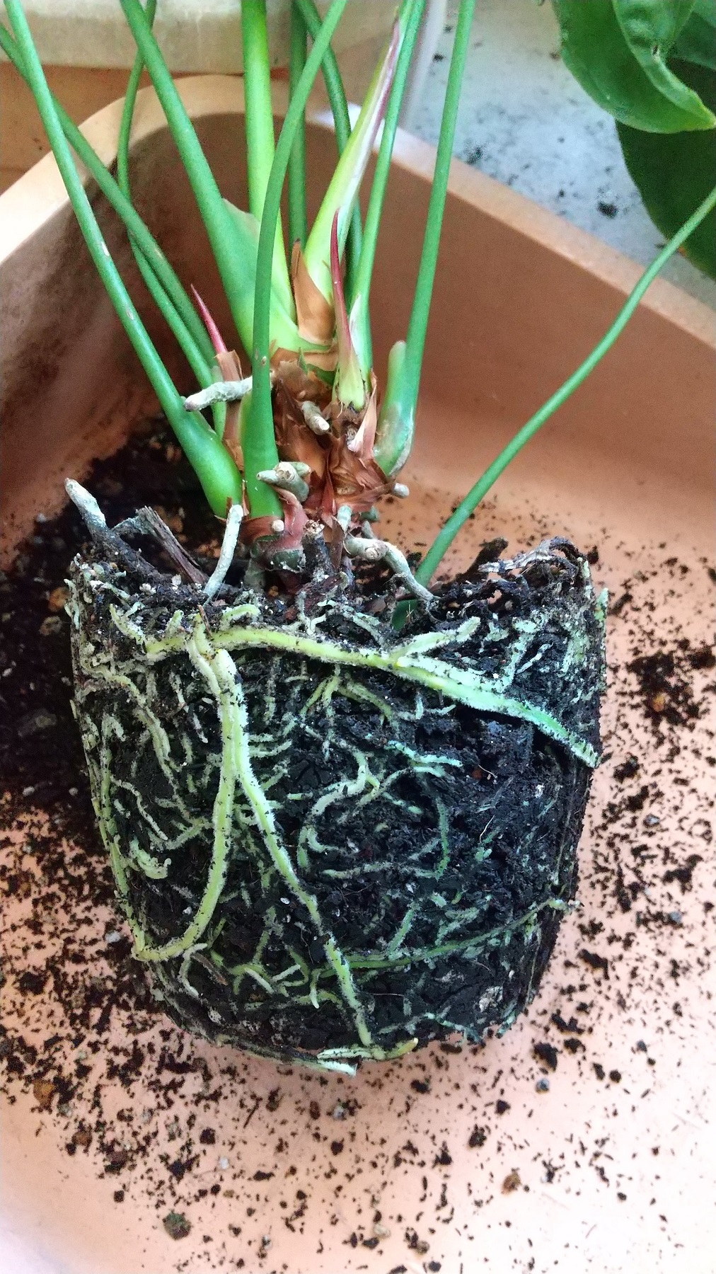 アンスリウム。室内置きなのでこの季節にもかかわらず、花は咲いたのだが、すぐに死んでしまう。あれまーと思って鉢を割ったらこのありさま。一回り大きな鉢に植え替えた。しばらくは根を張ることに尽力してください。そもそもこいつ、もともとは一鉢だったの...